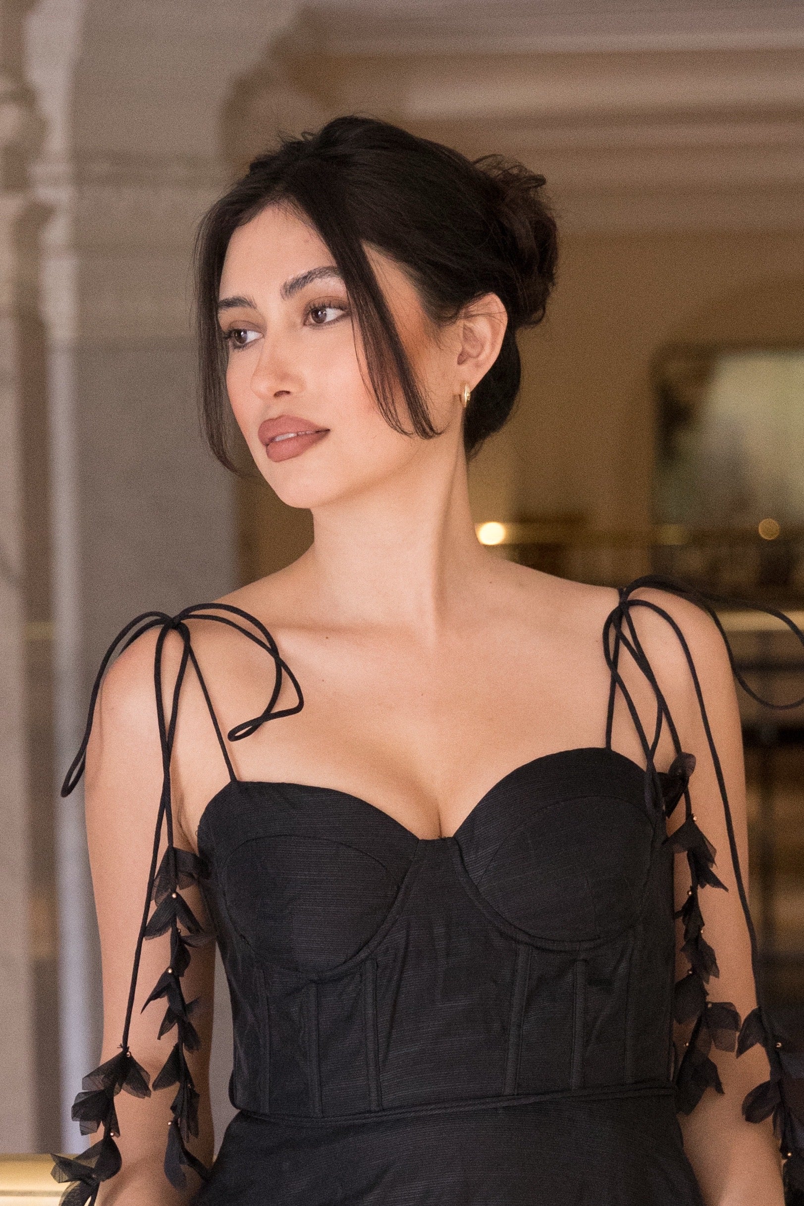Turn heads with this elegant and modern black off-shoulder midi dress, designed to exude timeless glamour and subtle drama. Featuring a structured, sweetheart neckline with a corset-style bodice for a flattering silhouette, this dress stands out with its delicate off-shoulder tie-up sleeves adorned with statement black floral appliqués. The A-line skirt flows gracefully to mid-calf length, made from a sheer organza-like overlay that adds texture and movement. Perfect for formal events, galas, or a sophisticated evening out, this dress pairs beautifully with sleek heels and minimal jewelry for a bold yet refined look.